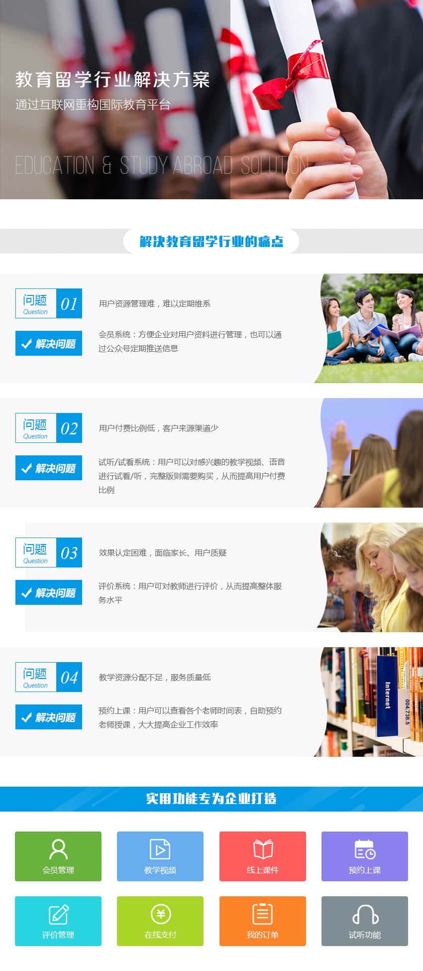 会员管理、教学视频、线上课件、预约上课、评价管理、在线支付、我的订单、试听功能
